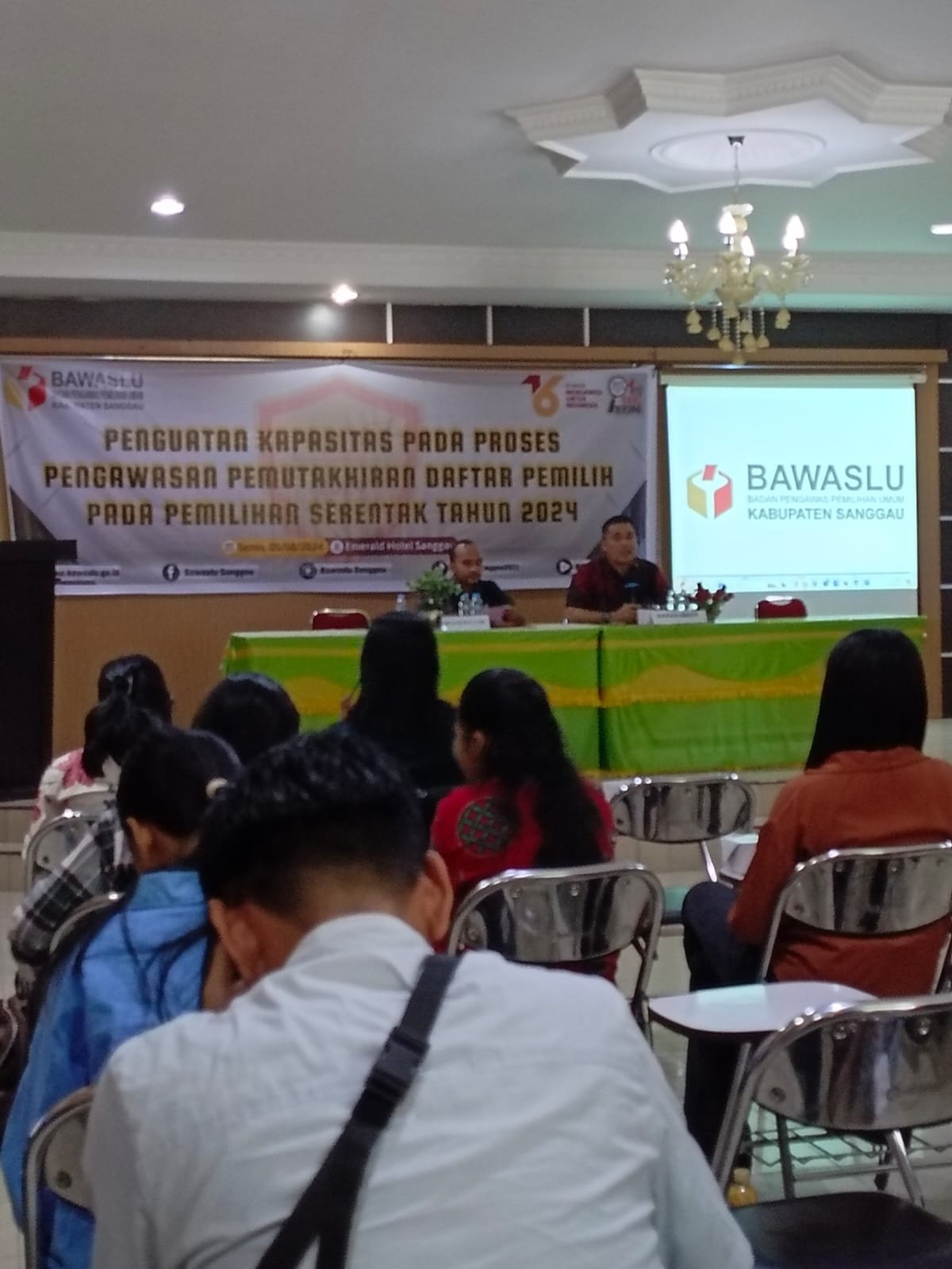 Suaraanakkolong.co.id-Badan Pengawas Pemilu (Bawaslu) Kabupaten Sanggau mengadakan rapat penguatan kapasitas proses pengawasan pemutakhiran daftar pemilih pada pemilihan serentak tahun 2024, yang berlansung diruangan meeting room 1 hotel Emerland, Jalan Jl. Jend. Sudirman, Kelurahan Beringin, Kecamatan Kapuas, Kabupaten Sanggau Senin (05/08/2024)