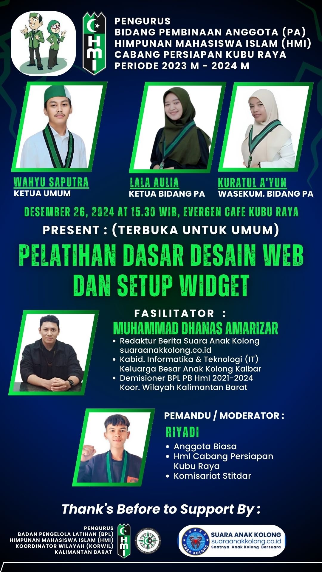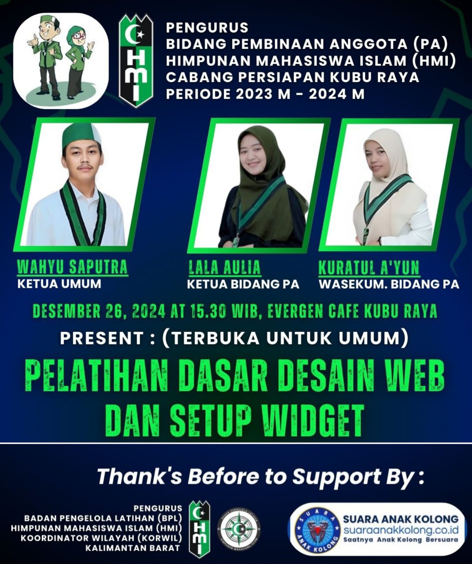 HmI Cabang Persiapan Kubu Raya Bidang Pembinaan Anggota melakukan kerjasama dengan SUARAANAKKOLONG.CO.ID dan BPL HmI Korwil  Kalimantan Barat terkait program pelatihan Desain Web dan SetUp Widget.