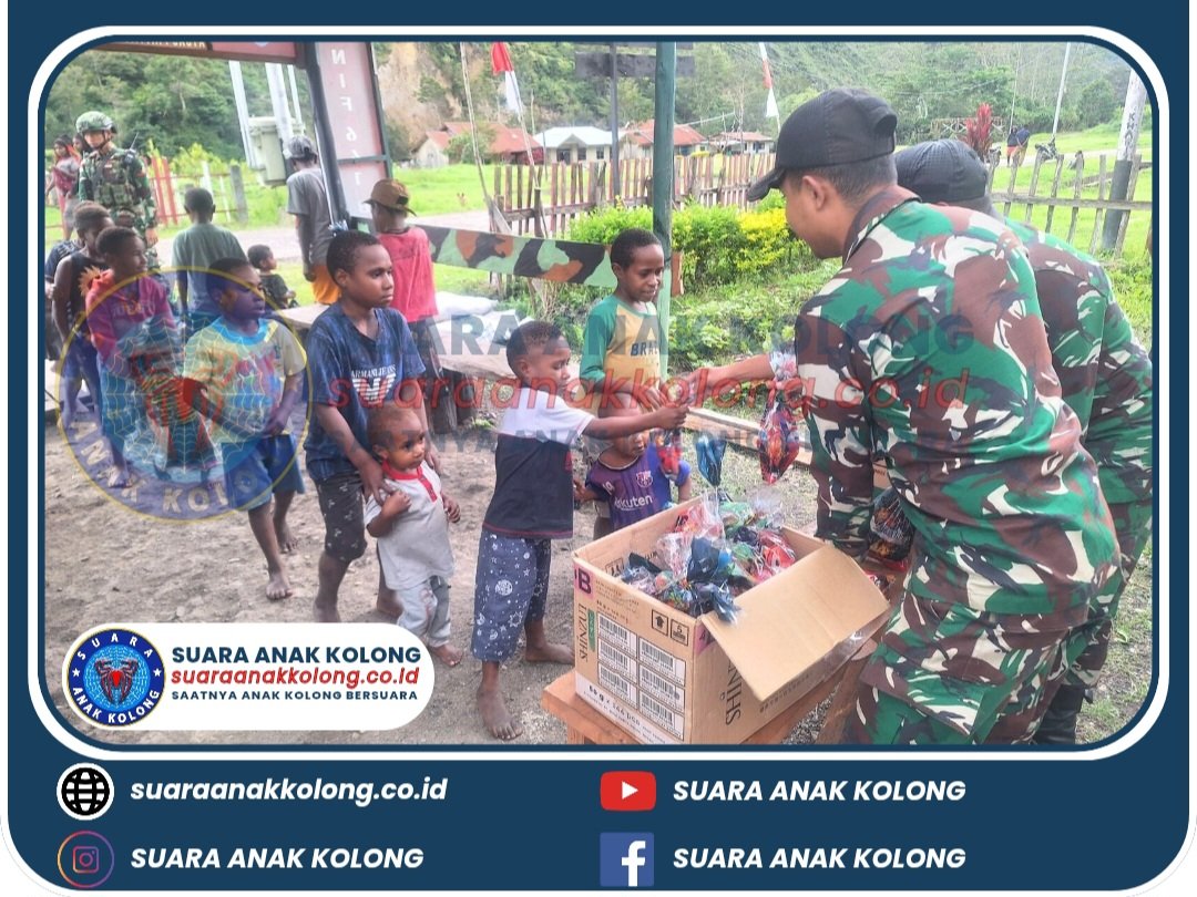 Yahukimo – Berbagi kebahagiaan kepada anak anak, Pos Kurima Satgas Yonif 641/Bru membagikan makanan ringan berupa snack kepada anak-anak Kampung Eroma, Distrik Kurima, Kabupaten Yahukimo, Provinsi Papua Pegunungan, (30/12/2024).