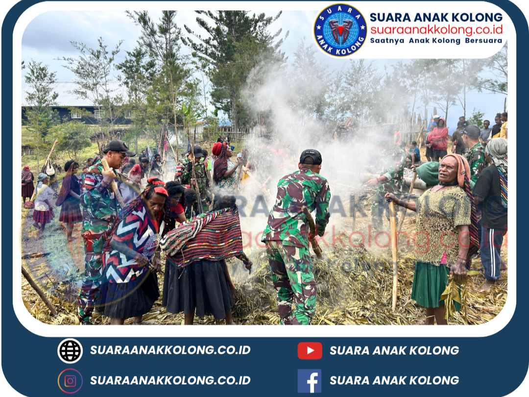 SUARAANAKKOLONG.CO.ID Jayawijaya – Bentuk kedekatan TNI dan Masyarakat personel Pos Napua mengikuti acara Adat Bakar Batu bersama warga di Gereja Kemah Injil (Kingmi) Sinode Papua Kelasis Baliem Tengah Jemaat Eklesia Sinagek, Distrik Napua, Kabupaten Jayawijaya, Provinsi Papua Pegunungan, (29/12/2024)