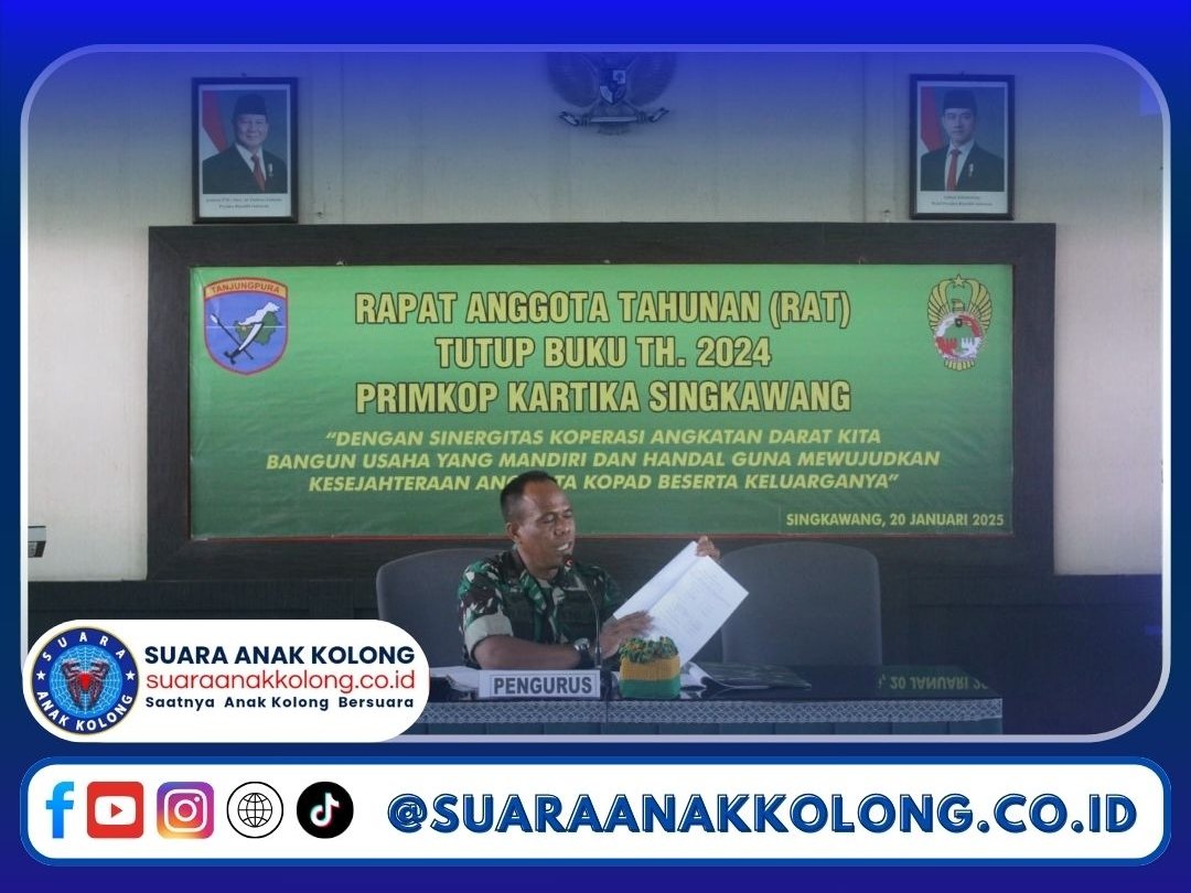 SUARAANAKKOLONG.CO.ID Singkawang, 20 Januari 2025 – Primkop Kartika Kodim 1202/Singkawang menggelar Rapat Anggota Tahunan (RAT) Tutup Buku Tahun 2024,Dengan mengusung tema “Sinergitas Koperasi Angkatan Darat, Kita Bangun Usaha yang Mandiri dan Handal untuk Mewujudkan Kesejahteraan Anggota KOPAD Beserta Keluarganya”, kegiatan ini menekankan pentingnya evaluasi dan penguatan kinerja koperasi untuk kesejahteraan anggota, bertempat di Aula Makodim 1202/Skw, Jl. Alianyang, Kel. Pasiran, Kec. Singkawang Barat, Kota. Singkawang.