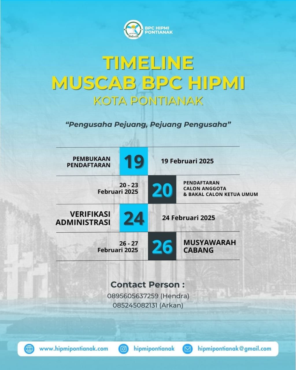 7. Melunasi biaya pendaftaran.Timeline MUSCAB BPC HIPMI Kota Pontianak: