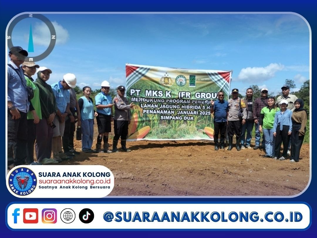 SUARAANAKKOLONG.CO.ID Ketapang, Kalbar – Dalam upaya mendukung ketahanan pangan, Polsek Simpang Dua Polres Ketapang bekerja sama dengan PT. MKS melaksanakan kegiatan penanaman jagung hibrida di lahan milik perusahaan pada 18 Februari 2025. Kegiatan ini dihadiri oleh Kapolsek Simpang Dua, IPDA Slamet Santoso, beserta anggota Polsek, perwakilan PT. MKS, dan masyarakat setempat.