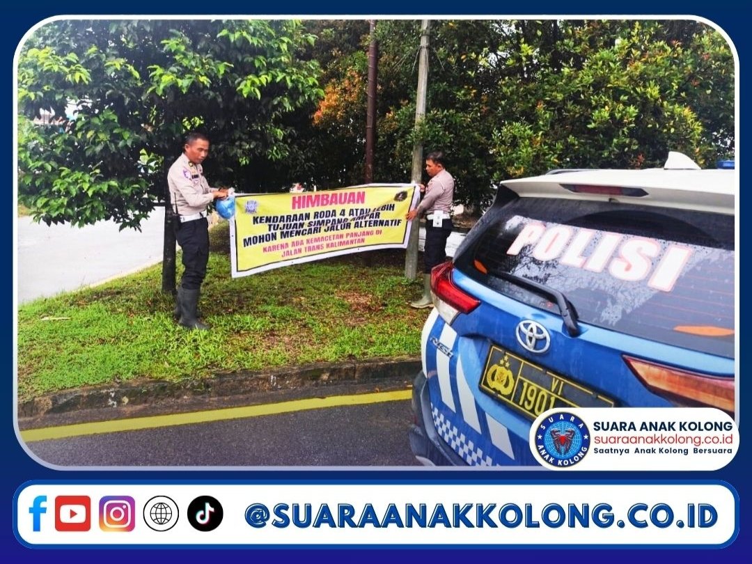 SUARAANAKKOLONG.CO.ID, Kubu Raya 08 Maret 2025 – Satuan Lalu Lintas (Satlantas) Polres Kubu Raya memasang spanduk imbauan di ruas Jalan Trans Kalimantan, tepatnya di KM 39 hingga KM 41, Desa Teluk Bakung, Kecamatan Ambawang, Kabupaten Kubu Raya. Imbauan ini ditujukan bagi pengendara agar memilih jalur alternatif guna menghindari kemacetan panjang akibat genangan banjir yang mencapai ketinggian hingga 45 cm atau setinggi betis orang dewasa.