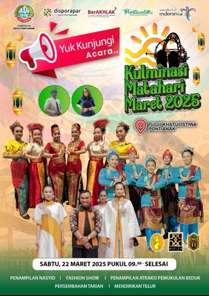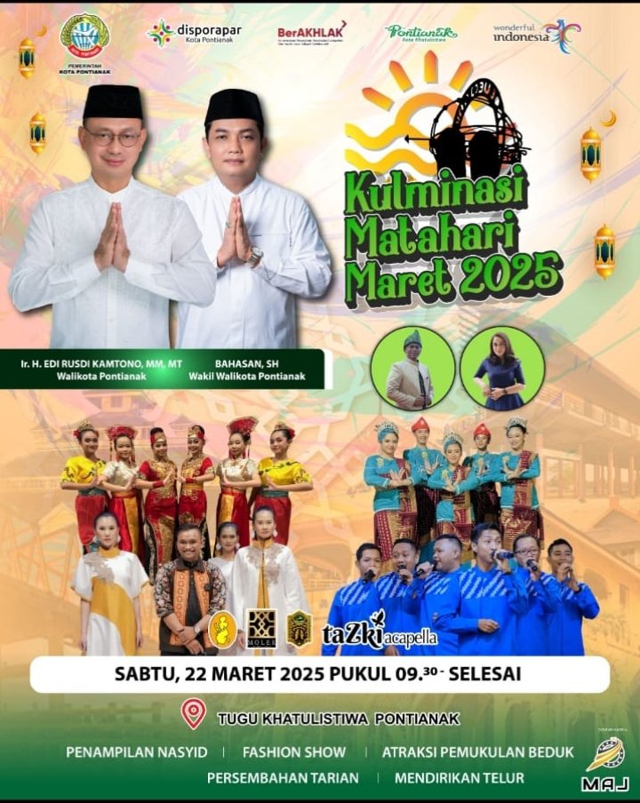 Sebagai satu-satunya kota besar di dunia yang dilalui garis khatulistiwa secara langsung, Pontianak selalu menjadikan kulminasi matahari sebagai daya tarik wisata dan edukasi ilmiah. Untuk memeriahkan momen ini, Wali Kota Pontianak, Edi Rusdi Kamtono, mengumumkan penyelenggaraan Festival Pesona Kulminasi Matahari 2025 yang akan berlangsung pada 21–23 Maret 2025 di Tugu Khatulistiwa.