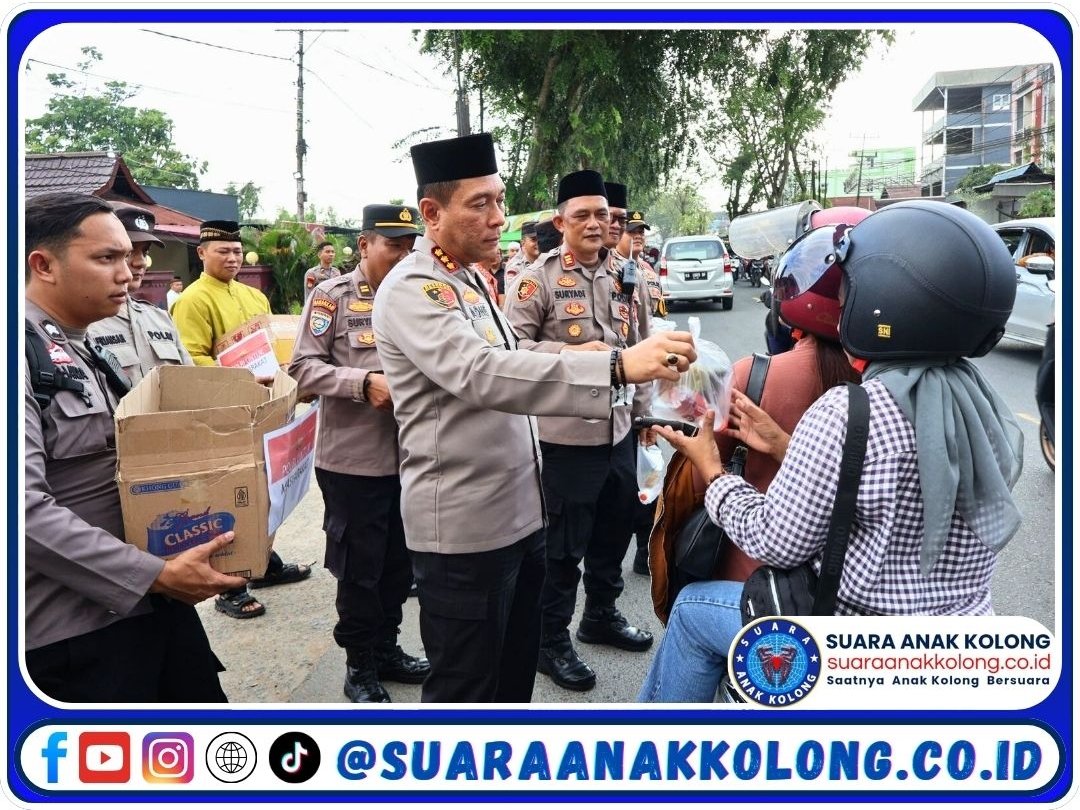 SUARAANAKKOLONG.CO.ID PONTIANAK, 24 Maret 2025 – Dalam semangat berbagi di bulan suci Ramadan, Kapolresta Pontianak, Kombes Pol Adhe Hariadi, S.I.K., M.H., bersama jajaran Pejabat Utama (PJU) Polresta Pontianak, Kapolsek Pontianak Utara AKP Suryadi, S.H., M.H., serta personel Polsek Pontianak Utara dan anggota Pokdarkamtibmas Kecamatan Pontianak Utara, menggelar pembagian takjil gratis di depan Mako Polsek Pontianak Utara, Senin (24/03/2025).