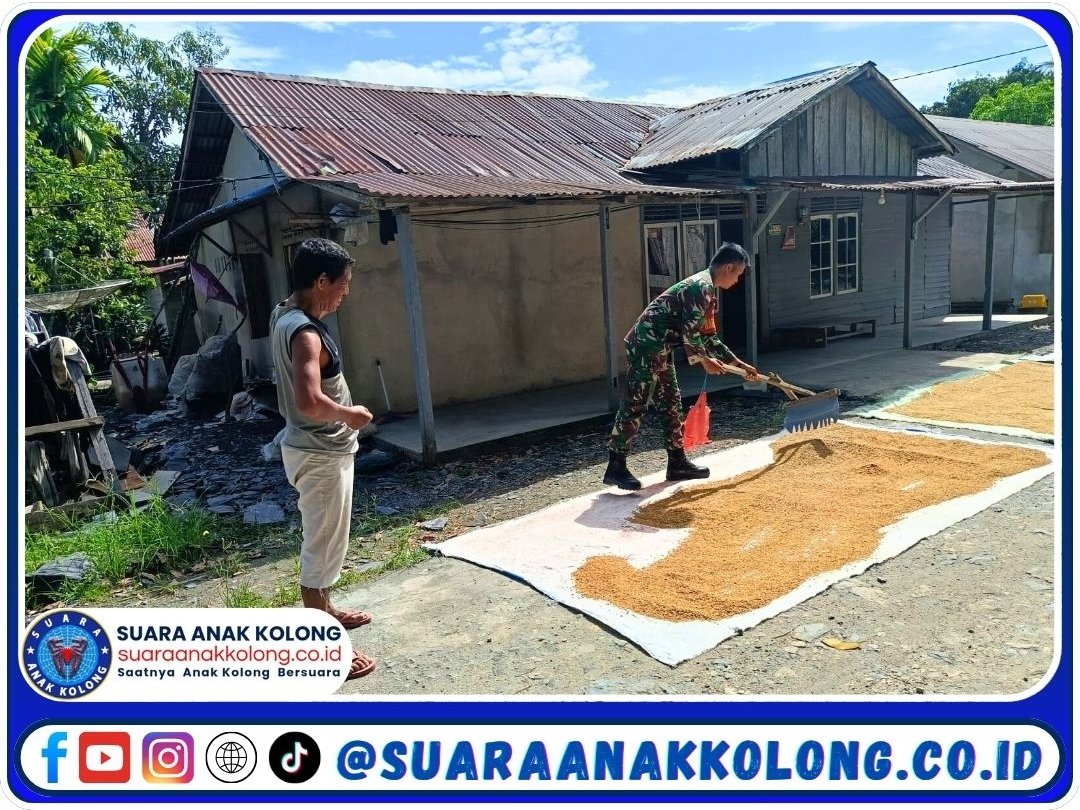 SUARAANAKKOLONG.CO.ID Sambas, 3 Juni 2025 — Dalam rangka menjaga mutu hasil panen dan mempererat hubungan dengan masyarakat desa binaan, Babinsa Desa Pusaka, Koramil 03/Tebas, Kodim 1208/Sambas, Kopda Jumari, turun langsung membantu petani menjemur padi di halaman rumah warga, Selasa (3/6/2025).