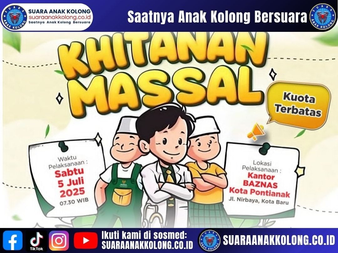 SUARAANAKKOLONG.CO.ID Pontianak, 11 Juni 2025 — Badan Amil Zakat Nasional (BAZNAS) Kota Pontianak kembali menggelar kegiatan sosial bertajuk Khitan Massal Gratis bagi masyarakat kurang mampu di wilayah Kota Pontianak. Kegiatan ini akan dilaksanakan pada Sabtu, 5 Juli 2025, bertempat di Kantor BAZNAS Kota Pontianak, Jl. Nirbaya (Kota Baru), Kota Pontianak.