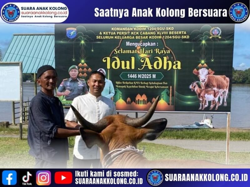 SUARAANAKKOLONG.CO.ID SANGGAU — Hari Raya Idul Adha 1446 H/2025 M bukan hanya tentang penyembelihan hewan kurban, tetapi juga momentum menebarkan kasih sayang dan solidaritas sosial. Hal ini diwujudkan oleh Kodim 1204/Sanggau dalam kegiatan penyembelihan hewan kurban yang digelar di halaman Surau Alqodim, Makodim 1204/Sanggau, Tanjung Kapuas, Ilir Kota, Kecamatan Kapuas, Kabupaten Sanggau, Jumat (6/6/2025).