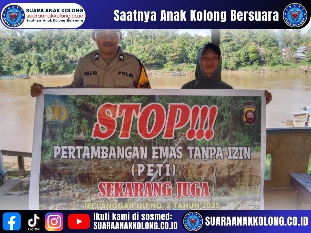 SUARAANAKKOLONG.CO.ID MELAWI — Kepolisian Sektor Ella Hilir, Polres Melawi, Polda Kalimantan Barat terus menggelar kampanye penolakan terhadap aktivitas Pertambangan Emas Tanpa Izin (PETI) sebagai upaya menjaga kelestarian lingkungan dan menegakkan hukum. Kampanye tersebut dilakukan secara humanis dan edukatif dengan menyasar masyarakat melalui pemasangan spanduk imbauan di sejumlah titik strategis. Minggu (8/6/2025).