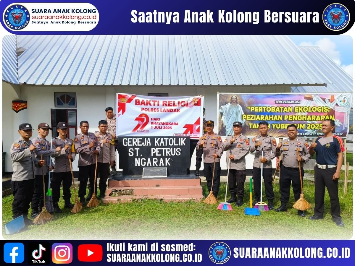SUARAANAKKOLONG.CO.ID – MANDOR, 14 Juni 2025 Sebagai bagian dari rangkaian peringatan Hari Bhayangkara ke-79, Polsek Mandor, Polres Landak, Polda Kalbar, menggelar kegiatan Bakti Religi di dua gereja yang berada di wilayah Kecamatan Mandor, Sabtu (14/6/2025). Kegiatan ini dilakukan untuk mempererat kemitraan dengan masyarakat dan menunjukkan kepedulian nyata Polri terhadap lingkungan sosial dan keagamaan.