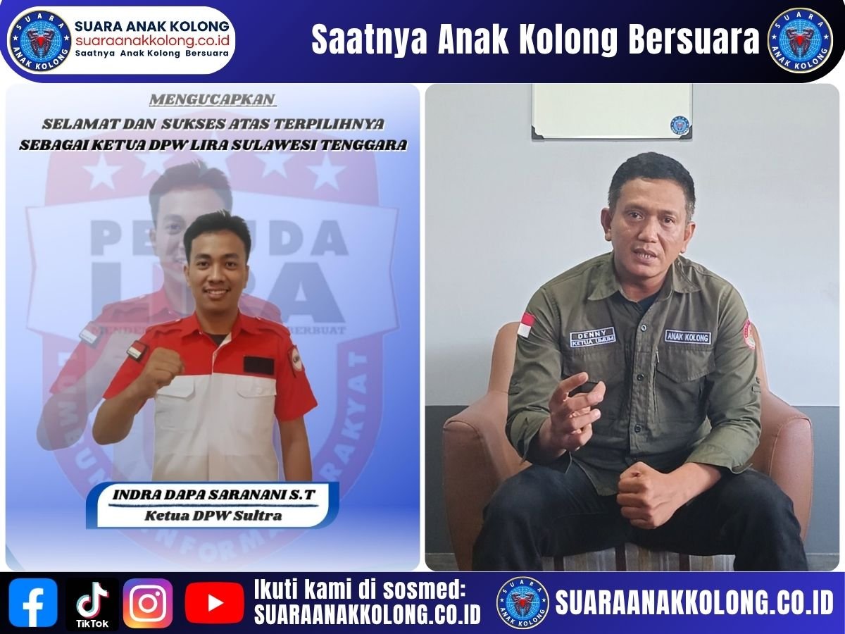 SUARAANAKKOLONG.CO.ID Pontianak – Jumat, 27 Juni 2025 Pimpinan Redaksi Media Berita Suara Anak Kolong, Denny Purwanto, menyampaikan ucapan selamat dan dukungan penuh kepada Indra Dapa Saranani atas amanah barunya sebagai Ketua Umum Dewan Pimpinan Wilayah (DPW) Pemuda LIRA Provinsi Sulawesi Tenggara. Ucapan tersebut disampaikan sebagai bentuk penghormatan dan solidaritas antar aktivis serta insan media yang turut memperjuangkan suara rakyat di seluruh wilayah Indonesia.