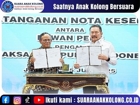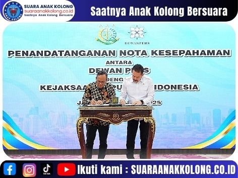 SUARAANAKKOLONG.CO.ID JAKARTA, 15 Juli 2025 – Kejaksaan Republik Indonesia dan Dewan Pers secara resmi menandatangani Nota Kesepahaman (MoU) pada Selasa (15/7/2025) di Jakarta. MoU ini bertajuk “Koordinasi Dalam Mendukung Penegakan Hukum, Perlindungan Kemerdekaan Pers, Peningkatan Kesadaran Hukum Masyarakat, serta Peningkatan Kapasitas Sumber Daya Manusia.”