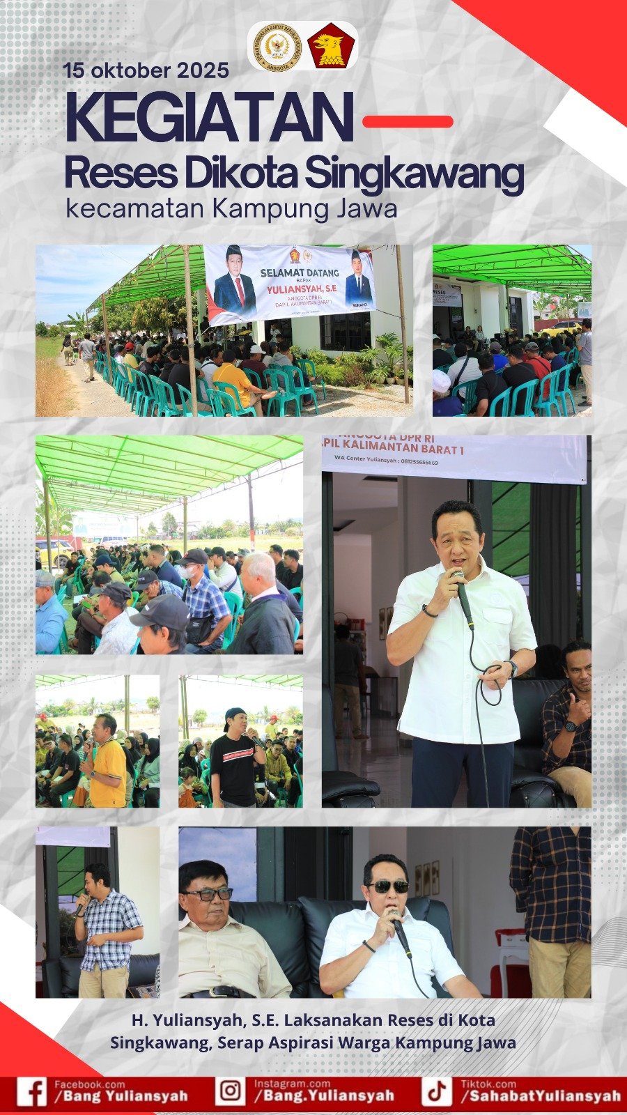 Singkawang, 15 Oktober 2025 — Anggota DPR RI Dapil Kalimantan Barat I, H. Yuliansyah, S.E., melaksanakan kegiatan Reses di Kota Singkawang, tepatnya di Kecamatan Kampung Jawa, Selasa (15/10/2025). Kegiatan ini menjadi wadah bagi masyarakat untuk menyampaikan aspirasi, masukan, serta berbagai persoalan yang dihadapi di tingkat akar rumput.