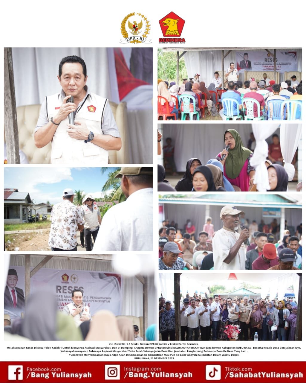 Anggota DPR RI Komisi V dari Fraksi Partai Gerindra, Yuliansyah, S.E., melaksanakan kegiatan Reses Masa Persidangan I Tahun Sidang 2025-2026 di Desa Telok Radak 1, Kabupaten Kubu Raya, Kalimantan Barat, pada Minggu (20/12/2025).