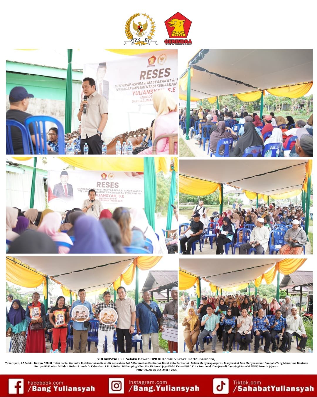 PONTIANAK – Anggota DPR RI Komisi V dari Fraksi Partai Gerindra, Yuliansyah, S.E., melaksanakan kegiatan Reses Masa Persidangan di Kelurahan PAL 5, Kecamatan Pontianak Barat, Kota Pontianak, pada Senin (22/12/2025).