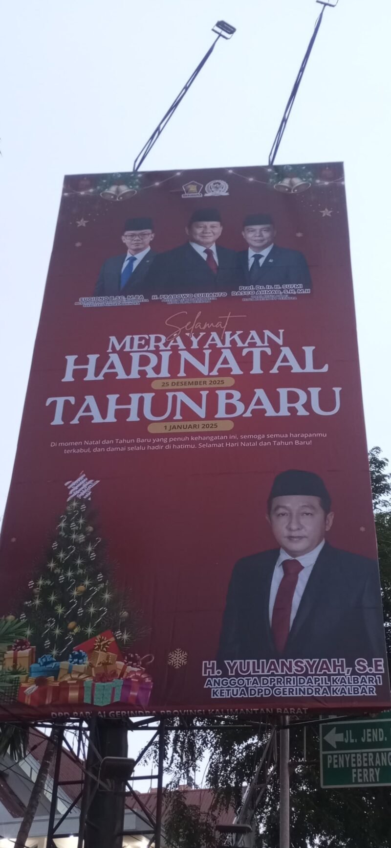 Pontianak 25/12/2025 – Memasuki penghujung tahun, Anggota DPR RI Dapil Kalimantan Barat 1 sekaligus Ketua DPD Gerindra Kalbar, H. Yuliansyah, S.E., menyampaikan ucapan selamat merayakan Hari Raya Natal 2025 dan Tahun Baru 2026 kepada seluruh masyarakat, khususnya di wilayah Kalimantan Barat.