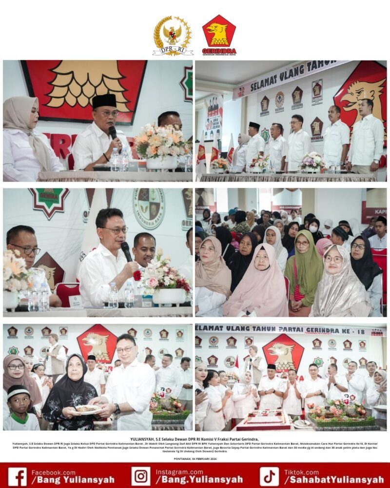 SuaraAnakKolongPONTIANAK Senin 08/02/2026 – Peringatan Hari Ulang Tahun (HUT) ke-18 Partai Gerindra yang digelar di Kantor DPD Partai Gerindra Kalimantan Barat berlangsung khidmat dan penuh rasa syukur. Dalam momen istimewa ini, Ketua DPD Partai Gerindra Kalbar yang juga Anggota DPR/MPR RI, H. Yuliansyah, S.E., menjadikan acara tersebut sebagai ajang berbagi kepedulian sosial pada Jumat 06 Februari 2026.