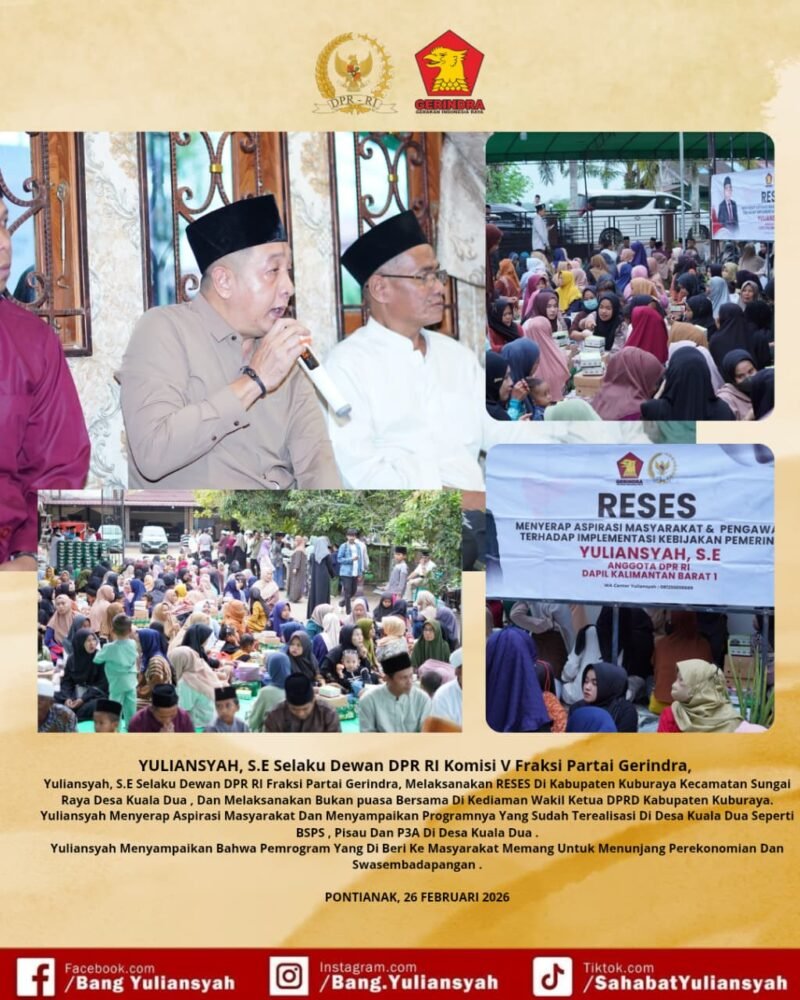 SuaraAnakKolong Kubu Raya– Anggota Komisi V DPR RI dari Fraksi Partai Gerindra, Yuliansyah, S.E., kembali turun ke daerah pemilihannya (Dapil Kalimantan Barat 1) untuk melaksanakan kegiatan Reses. Kali ini, kegiatan silaturahmi dan jaring asmara (jaring aspirasi masyarakat) tersebut dipusatkan di Desa Kuala Dua, Kecamatan Sungai Raya, Kabupaten Kubu Raya, pada tanggal 26 Februari 2026.