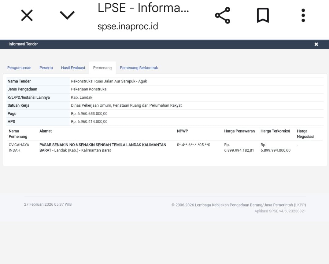 SuaraAnakKolong LANDAK – Aroma tak sedap mengiringi proyek Rekonstruksi Ruas Jalan Aur Sampuk – Agak Tahun Anggaran 2024 di Kabupaten Landak. Proyek bernilai miliaran rupiah yang bersumber dari Dana Transfer Umum – Dana Bagi Hasil (DBH) Sawit 2023 itu kini disorot tajam. Dua perusahaan peserta tender, CV Jaya Kembar dan CV Cahaya Indah, diduga tidak benar-benar bersaing secara sehat.
