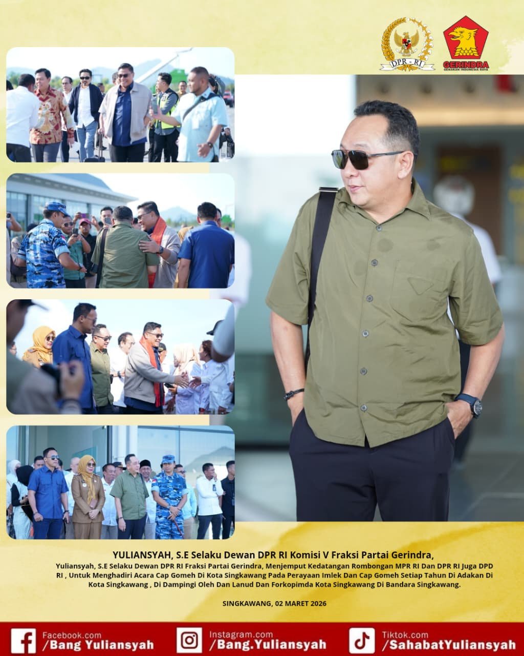 SINGKAWANG – Suasana penuh kehangatan dan kekompakan terlihat di Bandara Singkawang pada Senin (2/3/2026). Anggota Komisi V DPR RI dari Fraksi Partai Gerindra, Yuliansyah, S.E., tampil santai namun penuh karisma saat memimpin penyambutan rombongan besar dari ibu kota.