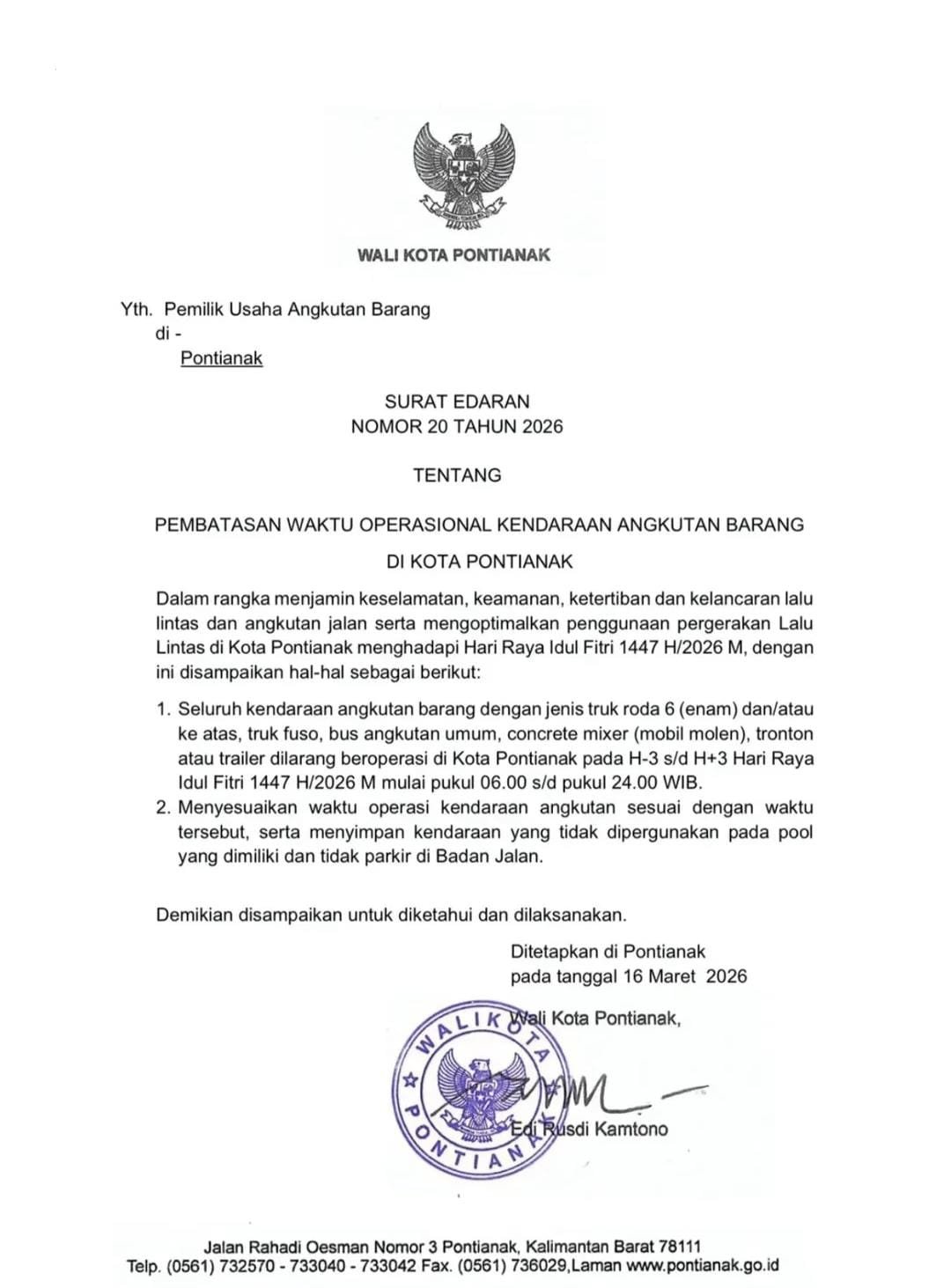 PONTIANAK, suaraanakkolong.co.id – Pemerintah Kota Pontianak resmi menerbitkan Surat Edaran (SE) Nomor 20 Tahun 2026 mengenai pengaturan lalu lintas angkutan barang guna menjamin kelancaran arus mudik dan balik Hari Raya Idul Fitri 1447 H.