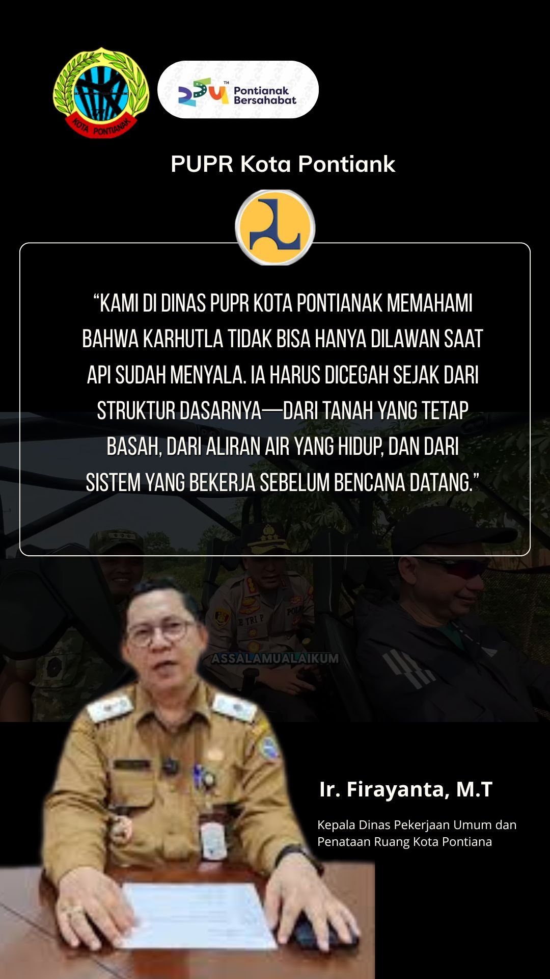 > “Kami di Dinas PUPR Kota Pontianak memahami bahwa karhutla tidak bisa hanya dilawan saat api sudah menyala. Ia harus dicegah sejak dari struktur dasarnya—dari tanah yang tetap basah, dari aliran air yang hidup, dan dari sistem yang bekerja sebelum bencana datang.” Ir. Firayanta, M.T