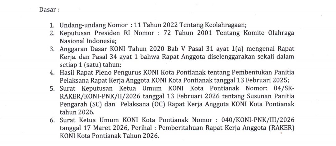 Ketua Pelaksana, Ismail E. Rembe dalam kata sambutannya menerangkan: Rapat Kerja Anggota KONI Kota Pontianak tahun 2026 ini, berdasarkan: