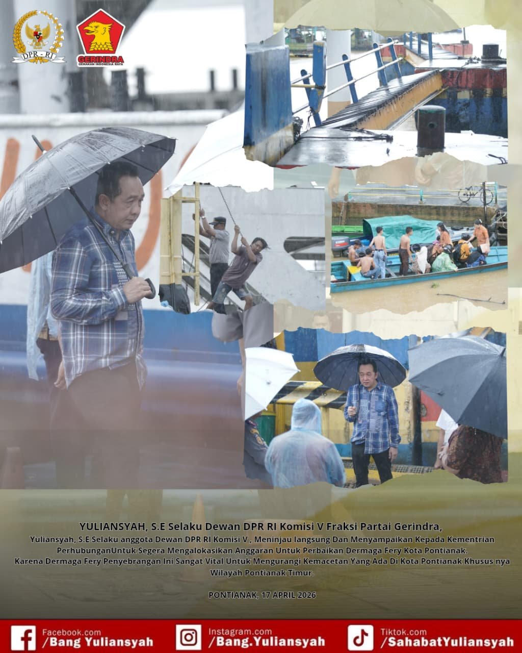 PONTIANAK suaraanakkolong.co.id–situasi siang di bardan siantan sedang hujan, namun hal itu tak menyurutkan langkah *Yuliansyah, S.E.* Anggota DPR RI Komisi V dari Fraksi Partai Gerindra ini terlihat berdiri tegap di tepi Dermaga Fery Penyeberangan Pontianak. Mengenakan kemeja kotak-kotak sederhana dan memegang payung sendiri, sorot matanya tajam menatap antrean kendaraan yang mengular dan kondisi dermaga yang kian memprihatinkan.